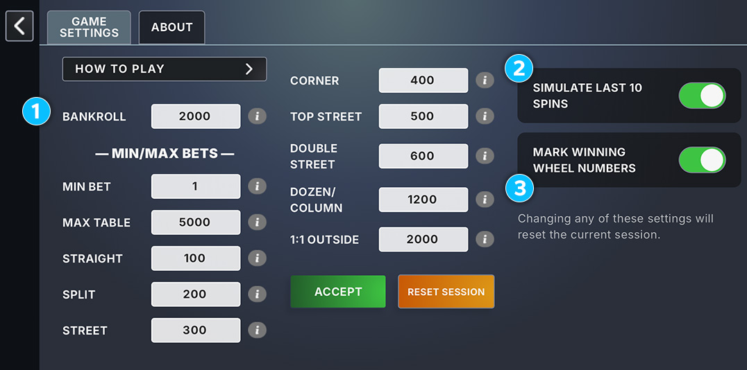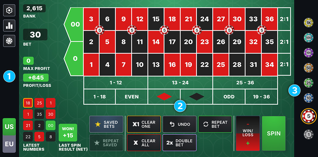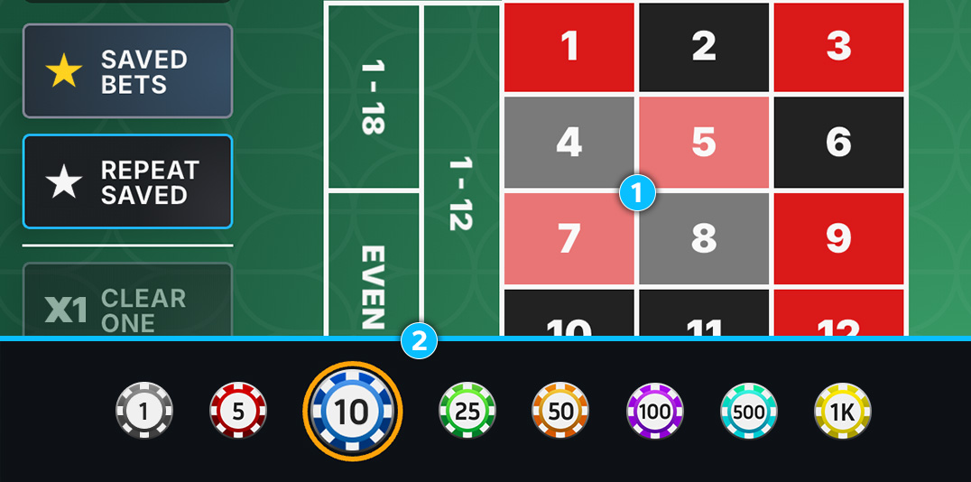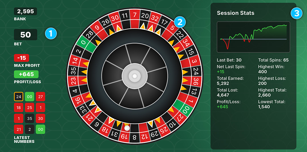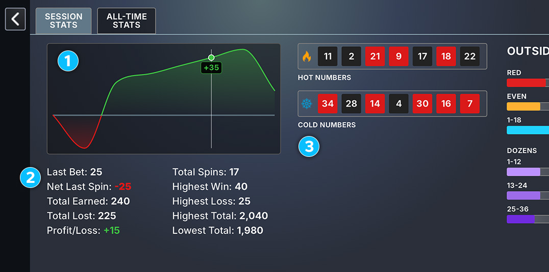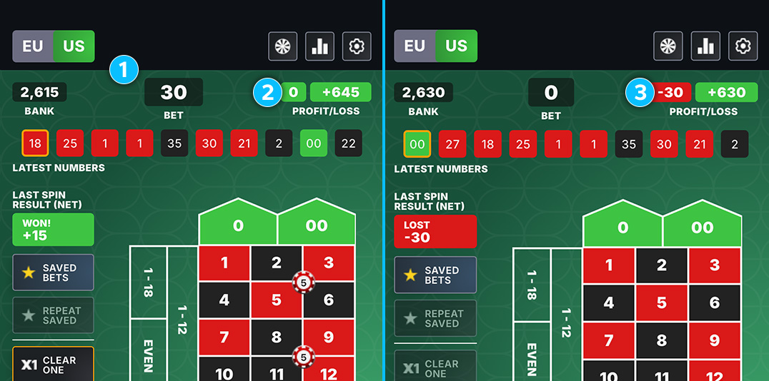 1 This section shows your current Bank balance, active Bet total, and session Profit/Loss.